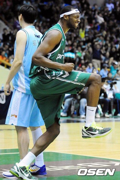 17일 오후 원주 치악체육관에서 열린 '2011-2012 KB국민카드 프로농구' 4강 플레이오프 1차전 원주 동부와 울산 모비스의 경기 1쿼터 동부 벤슨이 득점에 성공하자 환호하고 있다.