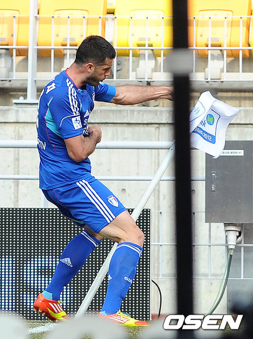 17일 오후 수원 월드컵경기장에서 열린 '현대오일뱅크 K리그 2012' 3라운드 수원 블루윙즈와 강원 FC의 경기, 후반 두번째 골을 성공시킨 수원 라돈치치가 환호하고 있다.