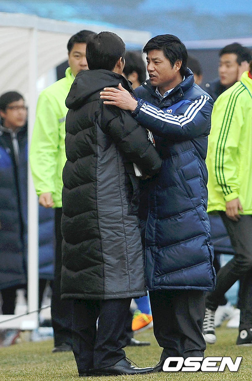 경기 후, 수원 윤성효 감독이 강원 김상호 감독과 인사를 나누고 있다.