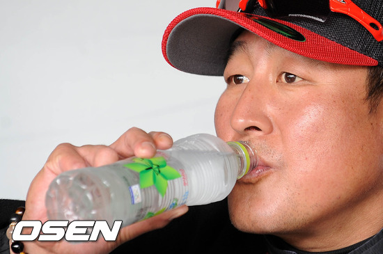 18일 오후 서울 잠실야구장에서 열린 삼성 라이온즈와 LG 트윈스의 시범 경기, 경기 전 LG 김기태 감독이 덕아웃에서 물을 마시고 있다.
