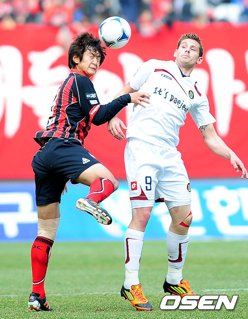 18일 오후 서울월드컵경기장에서 열린 '현대오일뱅크 2012 K리그' FC 서울과 대전 시티즌의 경기 전반 서울 김동우와 대전 케빈이 공중볼 다툼을 하고 있다.