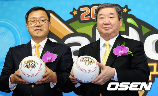 최재문 팔도 대표이사와 구본능 KBO 총재가 포토타임을 하고 있다.