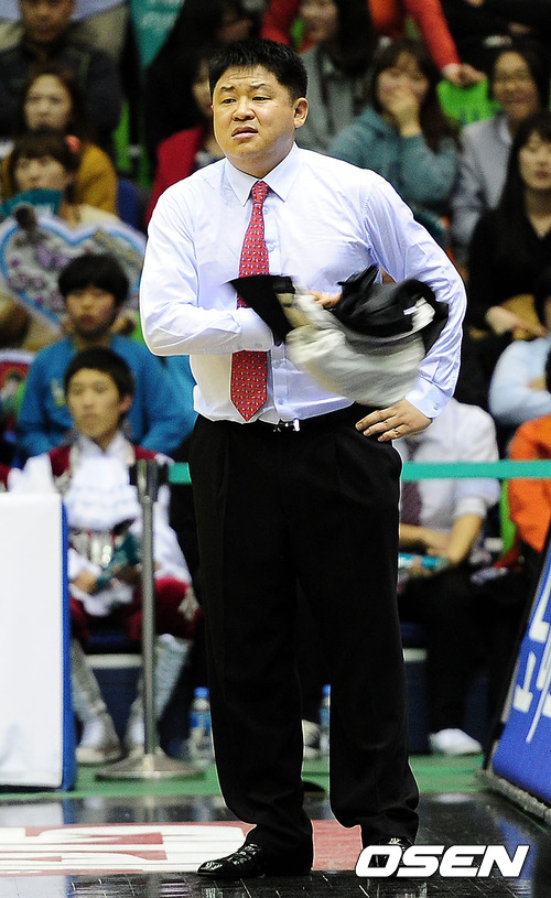 4쿼터 동부 강동희 감독이 이광재가 5반칙으로 물러나자 상의를 벗어 던지고 있다.
