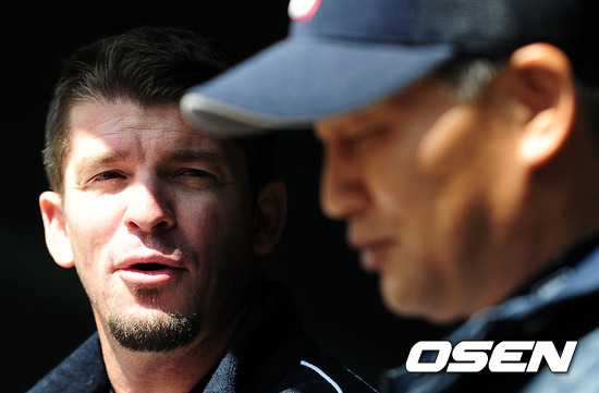 경기전 두산 프록터와 김진욱 감독이 이야기를 나누고 있다.