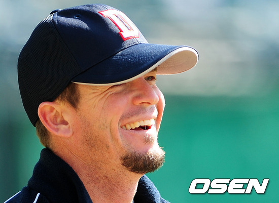 경기전 두산 프록터가 훈련을 하며 즐거워하고 있다.