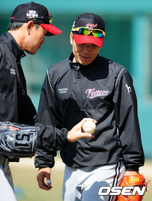 경기전 LG 봉중근과 이대진이 수비 훈련을 하며 이야기를 나누고 있다.