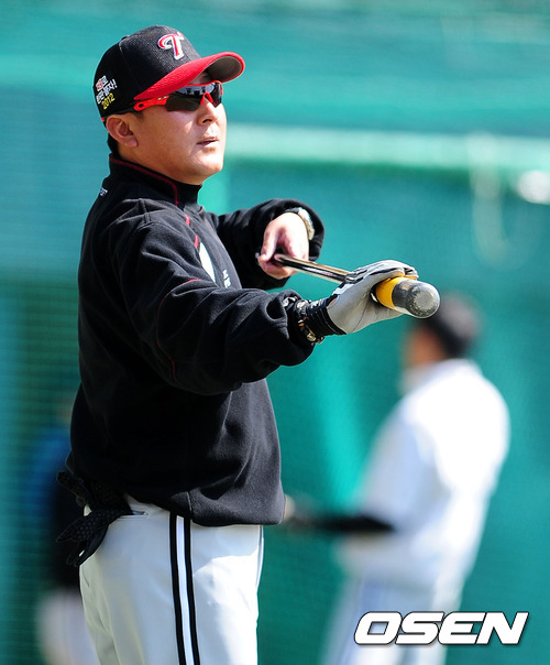 경기전 LG 김기태 감독이 펑고 볼을 직접 쳐주며 수비 훈련을 지도하고 있다.
