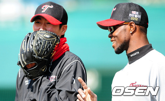 경기전 LG 우규민과 리즈가 수비 훈련을 이야기를 나누고 있다.