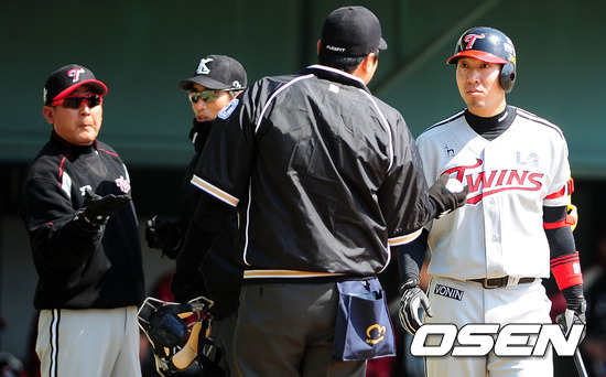 2회초 무사에서 사구로 1루에 출루하려던 LG 정성훈이 삼진으로 처리되자 김기태 감독과 불만을 나타내고 있다.