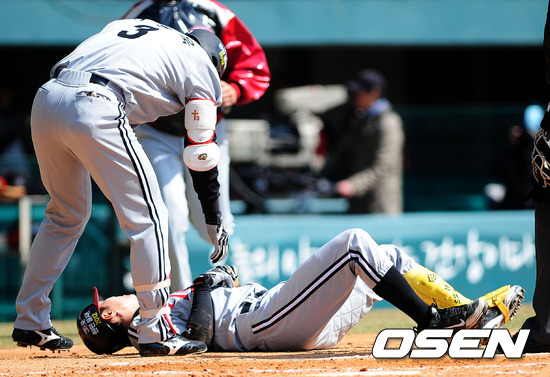 2회초 무사에서 LG 정성훈이 스윙 과정에서 볼에 손을 맞고 그라운드에 누워 괴로워하고 있다.