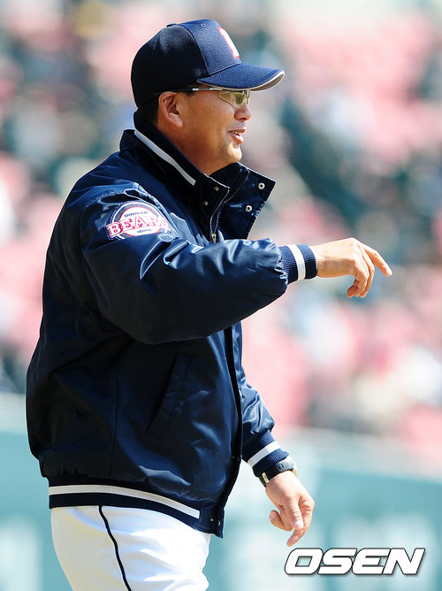 2회초 무사에서 두산 김진욱 감독이 미소를 지으며 판정에 불만을 나타내고 있다.
