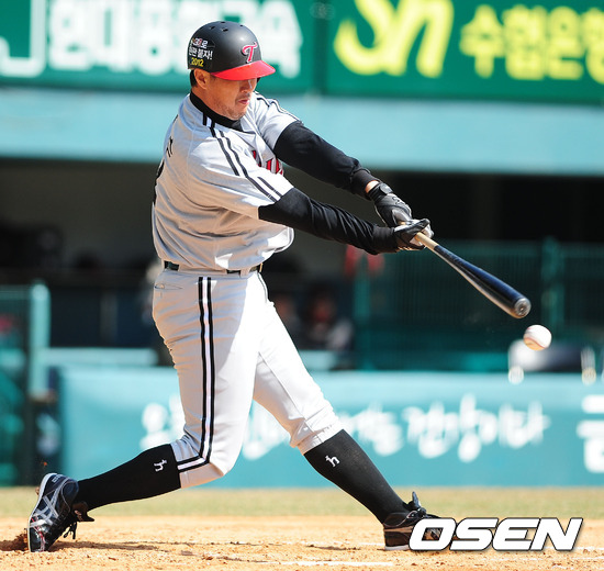 4회초 무사 1,3루에서 대타로 나선 LG 최동수가 내야땅볼을 날리고 있다.