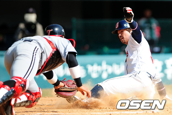 6회말 1사 3루에서 두산 오재원이 임재철의 외야플라이에 홈에서 세이프 되고 있다.