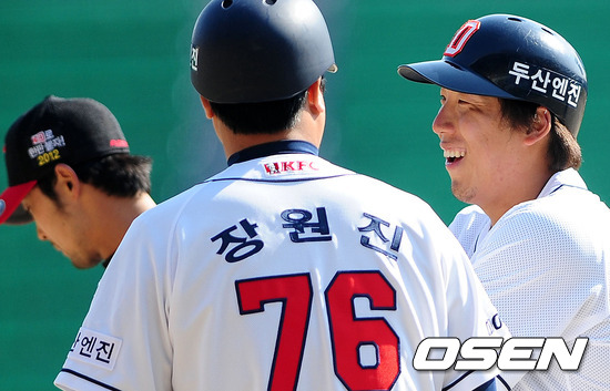 6회말 2사에서 두산 김현수가 안타를 날리고 장원진 코치와 이야기를 나누며 미소짓고 있다.