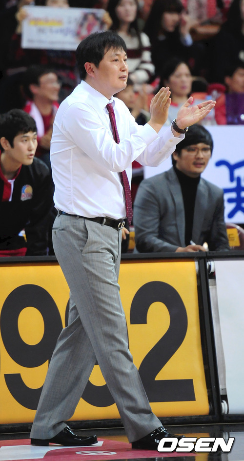20일 오후 안양 실내체육관에서 열린 '2011-2012 KB국민카드 프로농구' 4강 플레이오프 2차전 안양 인삼공사와 부산 KT의 경기 KGC 이상범 감독이 선수들을 격려 하고 있다.