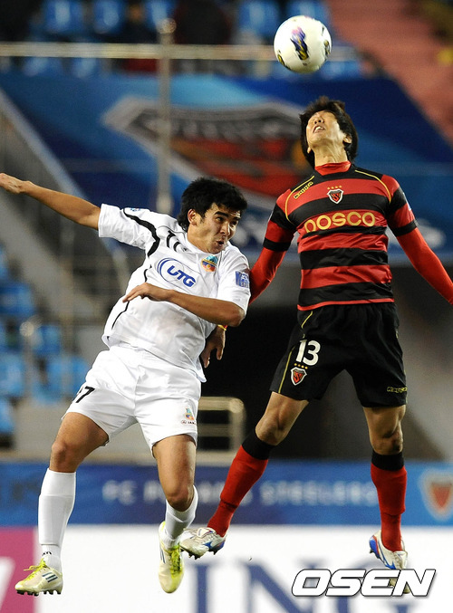 20일 오후 포항 스틸야드서 열린 '2012 AFC 챔피언스리그' 조별리그 E조 2차전 포항 스틸러스와 부뇨드코르(우즈베키스탄)의 경기, 전반 포항 김원일이 공중볼을 처리하고 있다.