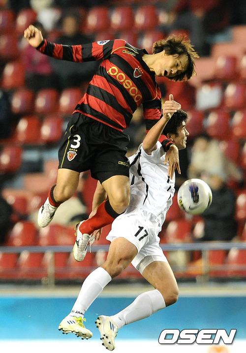 20일 오후 포항 스틸야드서 열린 '2012 AFC 챔피언스리그' 조별리그 E조 2차전 포항 스틸러스와 부뇨드코르(우즈베키스탄)의 경기, 전반 포항 김광석이 부뇨드코르 투라예프와 공중볼 다툼을 하고 있다.