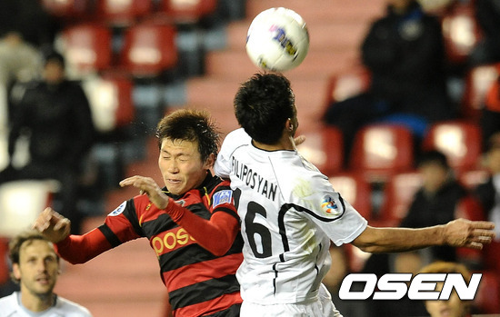 20일 오후 포항 스틸야드서 열린 '2012 AFC 챔피언스리그' 조별리그 E조 2차전 포항 스틸러스와 부뇨드코르(우즈베키스탄)의 경기, 전반 포항 김태수와 부뇨드코르 필리포스얀이 공중볼 다툼을 하고 있다.