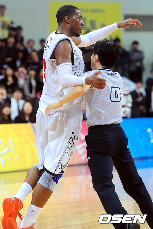 20일 오후 안양 실내체육관에서 열린 '2011-2012 KB국민카드 프로농구' 4강 플레이오프 2차전 안양 인삼공사와 부산 KT의 경기 3쿼터 KT 로드가 인삼공사 양희종과 몸싸움이 벌어지자 심판이 말리고 있다.