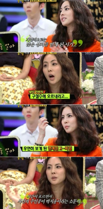 이어 박지윤은 "어느 날 인터넷에 '연예인 X파일'이 올라와 있더라. 그런데 며칠 후에 보니 그 이야기의 주인공이 나였다"며 "고위간부와의 만났다는 이상한 소문이더라"고 덧붙였다.