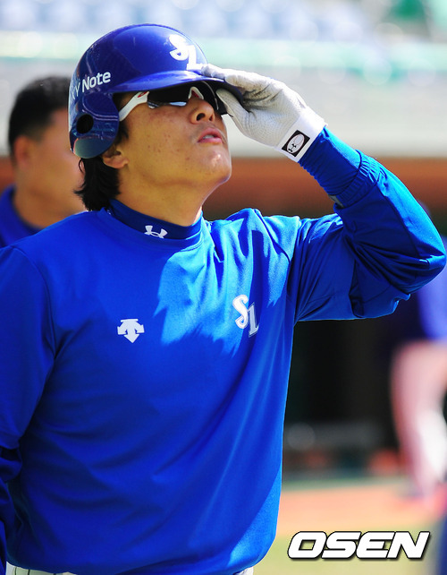 21일 오후 인천 문학구장에서 SK 와이번스와 삼성 라이온즈의 프로야구 시범경기가 열릴 예정인 가운데 오전 훈련시간에 삼성 이승엽이 헬멧을 눌러쓰고 타격연습을 하러 나오고 있다.