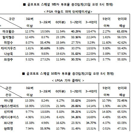 지정 선수별 1라운드 예상 스코어에서는 마크윌슨(40.29%), 필미켈슨(32.16%), 나상욱(31.02%), 최경주(30.72%)가 1~2언더로 우수한 성적을 기록할 것으로 집계됐다. 반면 위창수(33.47%), 타이거 우즈(30.60%)는 1~2오버 예상이 가장 높게 나타나 1라운드 부진이 예상됐다.