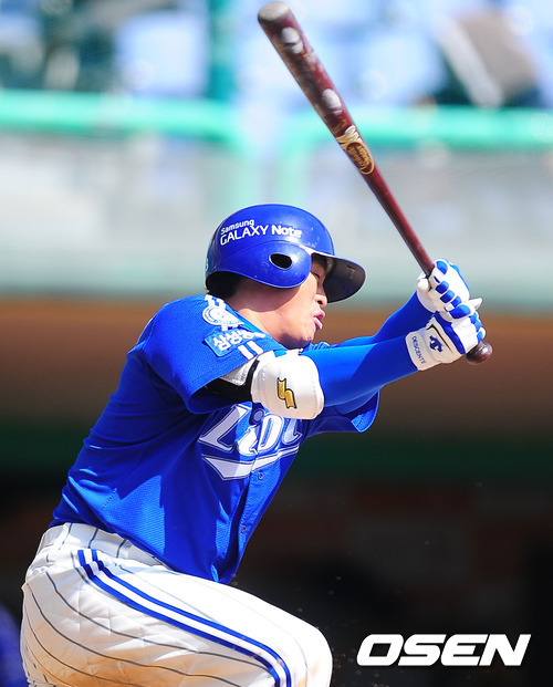 21일 오후 인천 문학구장에서 SK 와이번스와 삼성 라이온즈의 프로야구 시범경기에서 1회초 무사 주자 3루 삼성 박한이가 1타점 적시타를 날리고 있다.