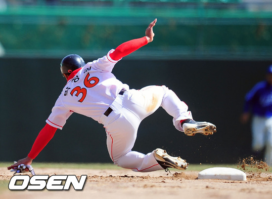 21일 오후 인천 문학구장에서 SK 와이번스와 삼성 라이온즈의 프로야구 시범경기에서 4회말 1사 주자 2루 SK 이호준 타석에서 차우찬의 2루 견제구가 빠지면서 2루 주자 박정권이 3루로 뛰려 할때 2루에서 넘어지고 있다.