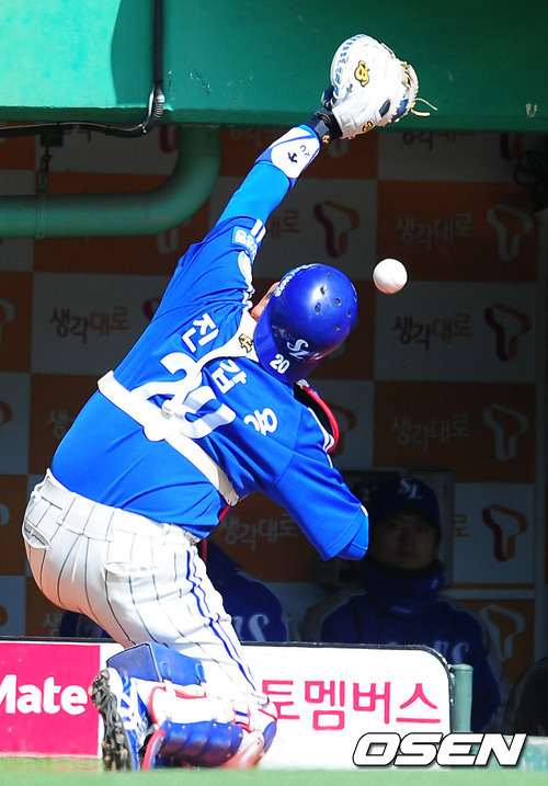 21일 오후 인천 문학구장에서 SK 와이번스와 삼성 라이온즈의 프로야구 시범경기에서 4회말 1사 주자 2루 SK 이호준의 타구가 뜨자 삼성 진갑용이 잡으려고 삼성 덕아웃쪽으로 뛰어갔으나 놓치고 있다.