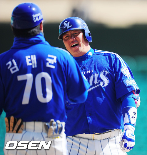 21일 오후 인천 문학구장에서 SK 와이번스와 삼성 라이온즈의 프로야구 시범경기에서 4회초 2사 주자 1루 삼성 진갑용이 중전 안타를 날린 후 1루에서 김태균 코치와 하이파이브를 하고 있다.