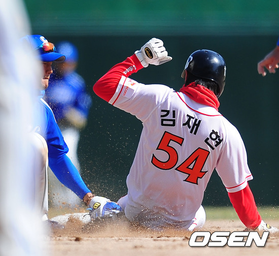 21일 오후 인천 문학구장에서 SK 와이번스와 삼성 라이온즈의 프로야구 시범경기에서 6회말 무사 주자 1루 SK 박정권 타석에서 1루 주자 김재현이 2루 도루를 시도, 삼성 김상수에게 태그아웃 당하고 있다.