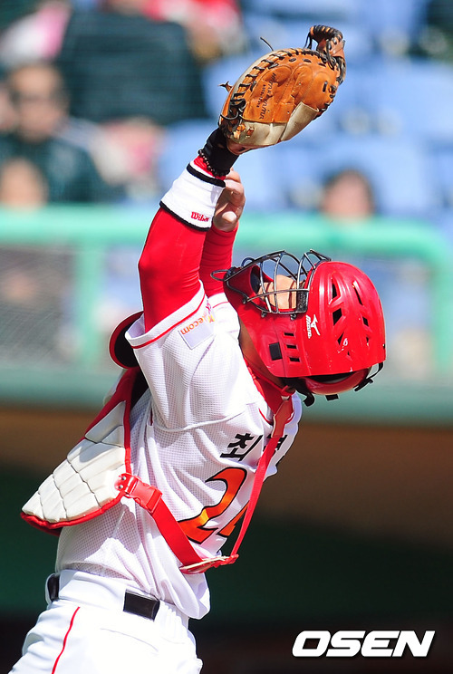 21일 오후 인천 문학구장에서 SK 와이번스와 삼성 라이온즈의 프로야구 시범경기에서 7회초 첫타석에서 삼성 진갑용의 뜬 타구를 SK 최경철이 잡아내고 있다.