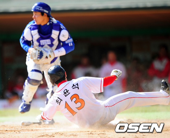 21일 오후 인천 문학구장에서 SK 와이번스와 삼성 라이온즈의 프로야구 시범경기에서 7회말 2사 주자 2루 SK 박재상의 1타점 적시타때 최윤석이 홈으로 몸을 날리고 있다.