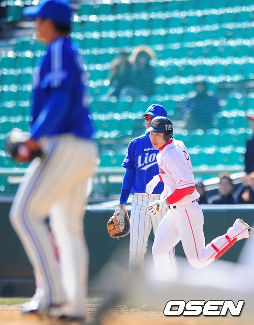21일 오후 인천 문학구장에서 SK 와이번스와 삼성 라이온즈의 프로야구 시범경기에서 7회말 2사 주자 2루 SK 안정광이 삼성 오승환에게 역전 투런포를 날린 후 안정광이 오승환을 바라보며 그라운드를 돌고 있다.