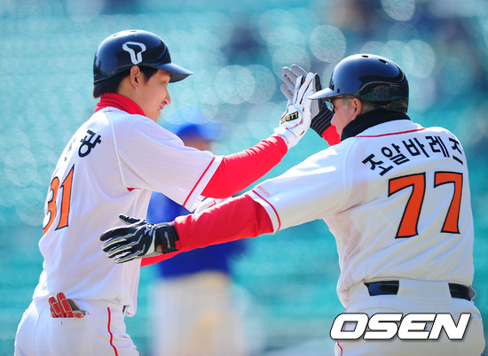 21일 오후 인천 문학구장에서 SK 와이번스와 삼성 라이온즈의 프로야구 시범경기에서 7회말 2사 주자 2루 SK 안정광이 삼성 오승환에게 역전 투런포를 날린 후 안정광이 3루에서 조알바레즈 코치와 하이파이브를 하고 있다.