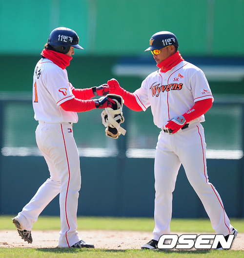 21일 오후 인천 문학구장에서 SK 와이번스와 삼성 라이온즈의 프로야구 시범경기에서 7회말 2사 주자 2루 SK 박재상이 1타점 적시타를 날린 후 2루에서 정경배 코치와 하이파이브를 하고 있다.