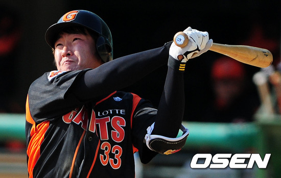 8회초 롯데 정훈이 솔로포를 날리고 타구를 바라보고 있다.