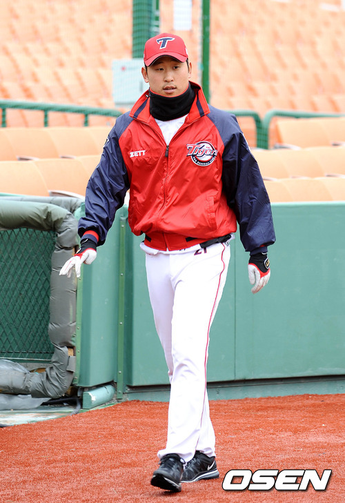 22일 오후 부산 사직야구장에서 열린 롯데 자이언츠와 KIA 타이거즈의 시범 경기, 경기 전 KIA 윤석민이 훈련을 마치고 덕아웃으로 가고 있다.