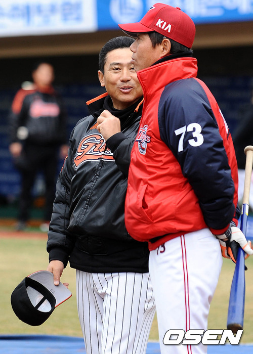 23일 오전 부산 사직야구장에서 열린 롯데 자이언츠와 KIA 타이거즈의 시범 경기, 경기 전 롯데 박정태 코치와 KIA 이건열 코치가 이야기를 나누고 있다.