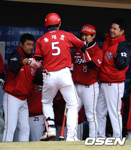 23일 오후 부산 사직야구장에서 열린 롯데 자이언츠와 KIA 타이거즈의 시범 경기, 4회초 무사에서 KIA 홍재호가 좌월 솔로 홈런을 치고 덕아웃에서 동료들의 축하를 받고 있다.