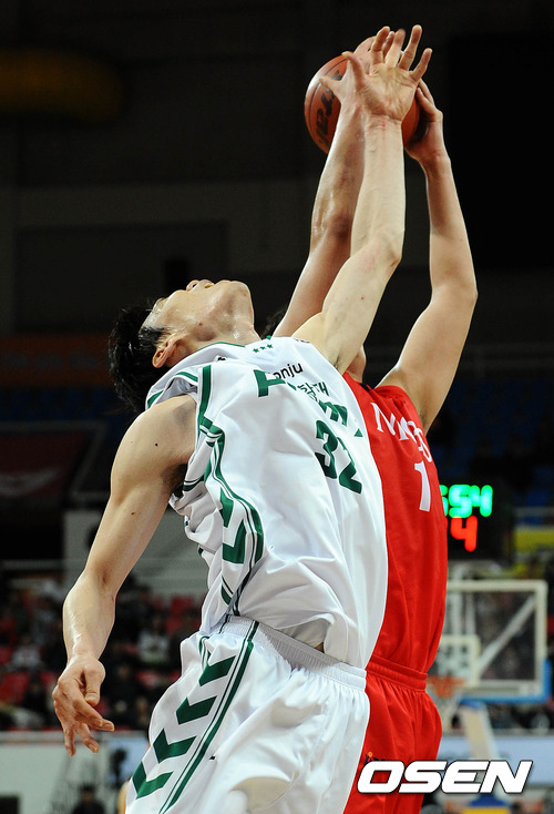 23일 오후 울산 동천체육관에서 벌어진 '2011~2012시즌 KB국민카드 프로농구' 4강 플레이오프(PO) 4차전 울산 모비스와 원주 동부의 경기, 2쿼터 동부 김주성과 모비스 함지훈이 리바운드 다툼을 하고 있다.