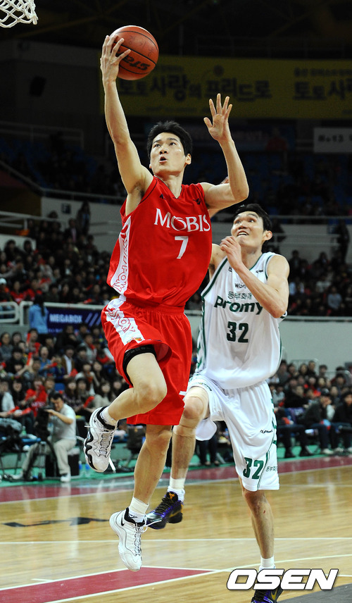 23일 오후 울산 동천체육관에서 벌어진 '2011~2012시즌 KB국민카드 프로농구' 4강 플레이오프(PO) 4차전 울산 모비스와 원주 동부의 경기, 2쿼터 모비스 박종천의 레이업슛때 동부 김주성이 뒤에서 수비를 하기 위해 뛰어오르고 있다.