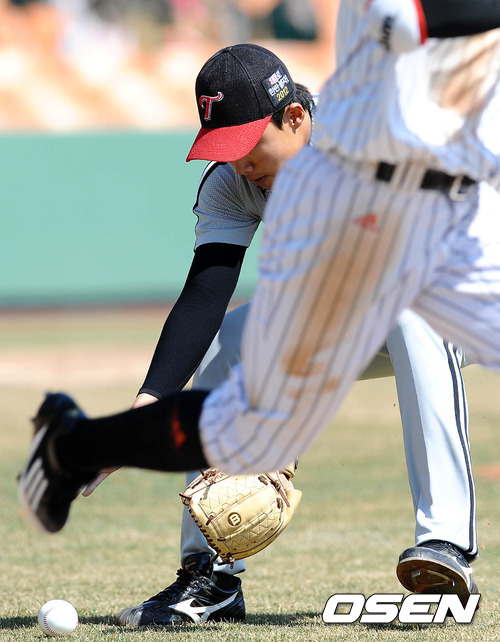24일 오후 부산 사직야구장에서 열린 롯데 자이언츠와 LG 트윈스의 시범 경기, 3회말 무사 롯데 이승화의 번트때 LG 임찬규가 공을 잡고 있다.