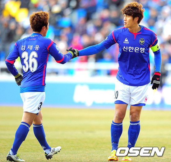 24일 오후 인천 숭의아레나파크에서 열린 '현대오일뱅크 K리그 2012' 인천 유나이티드와 대전 시티즌의 경기 전반 인천 정인환이 김재웅 패스를 칭찬하고 있다.