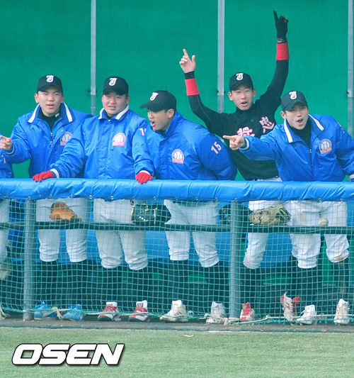 6회말 2사 만루의 위기 상황을 넘긴 장충고 덕아웃 선수들이 좋아하고 있다.