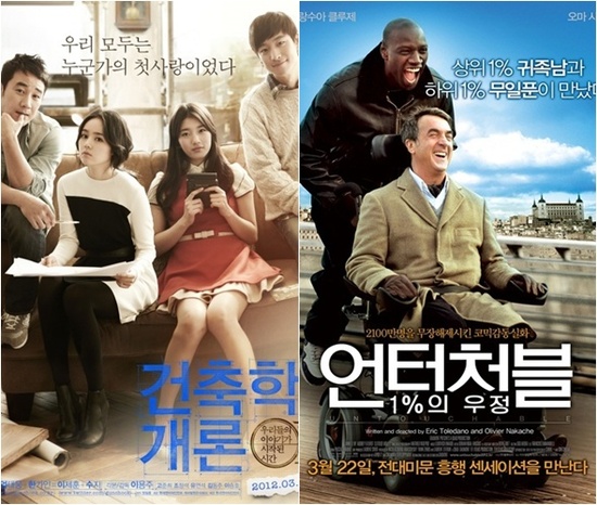 이날까지 누적 관객수는 '건축학'이 49만명, '언터처블' 29만명'으로 '건축학'이 크게 앞서고 있다. 그러나 방심할 처지는 못된다. '언터처블'은 가파른 상승세로 관객수를 늘리는 중이고 개봉 첫날 '건축학'의 절반정도에 불과했던 실제 점유 스크린 수도 쑥 올라왔다.