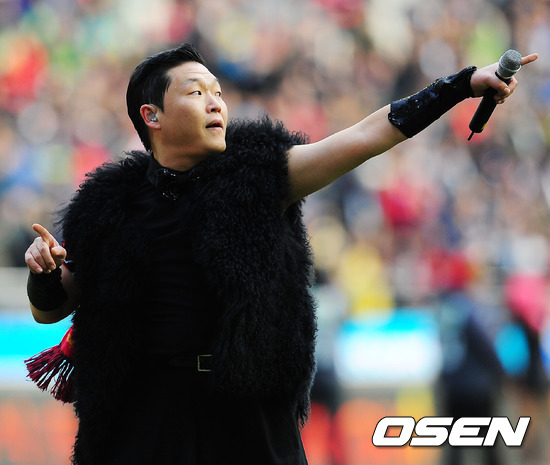 25일 오후 서울월드컵경기장에서 열린 FC 서울과 전북 현대의 '현대오일뱅크 K리그 2012' 4라운드에서 하프타임에 싸이가 그라운드 위에서 공연을 하고 있다.