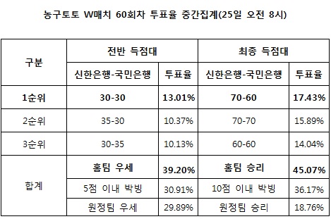 국민체육진흥공단(www.kspo.or.kr)이 발행하는 체육진흥투표권 수탁사업자인 스포츠토토의 공식 온라인 발매 사이트 베트맨(www.betman.co.kr)이 26일 오후 5시 안산와동실내체육관에서 벌어지는 신한은행-국민은행전 대상 농구토토 W매치 60회차 게임 투표율을 중간 집계한 결과, 전체 참가자의 45.07%는 신한은행의 승리를 예상했다고 전했다.