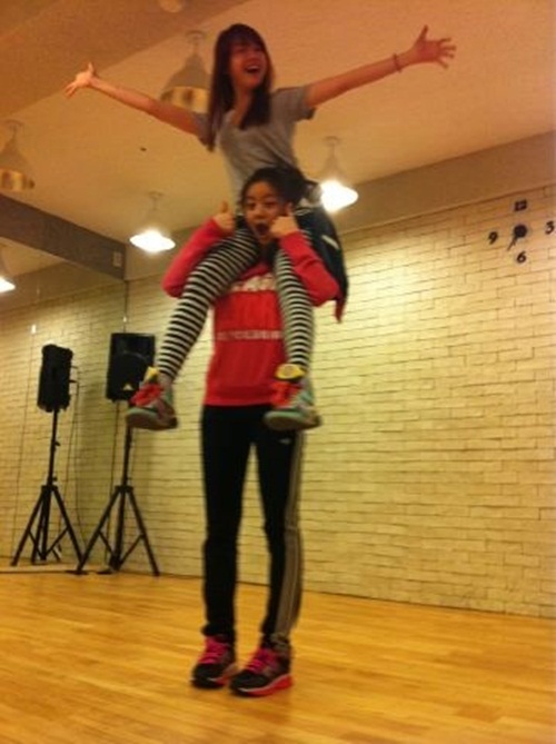 사진 속 민아는 같은 그룹 멤버 혜리의 어깨에 올라타 만세를 부르며 즐거워 하고 있는 모습. 이와 반대로 혜리는 민아가 무겁다는 듯 양 엄지를 들어올리며 벌어진 입을 다물지 못하고 있다.