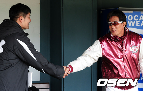 경기전 XTM해설자로 변신한 이숭용과 넥센 김시진 감독이 악수를 하며 인사를 나누고 있다.